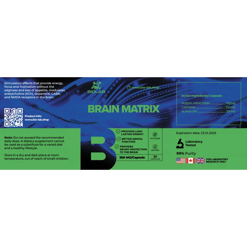 Brain Matrix Mix 350mg 30 caps is a powerful research-grade nootropic formulated to support memory, focus, mental clarity, and overall cognitive performance. Widely used in research and brain optimization studies, this nootropic blend is designed to enhance attention, information retention, and executive function in both laboratory and personal cognitive applications.